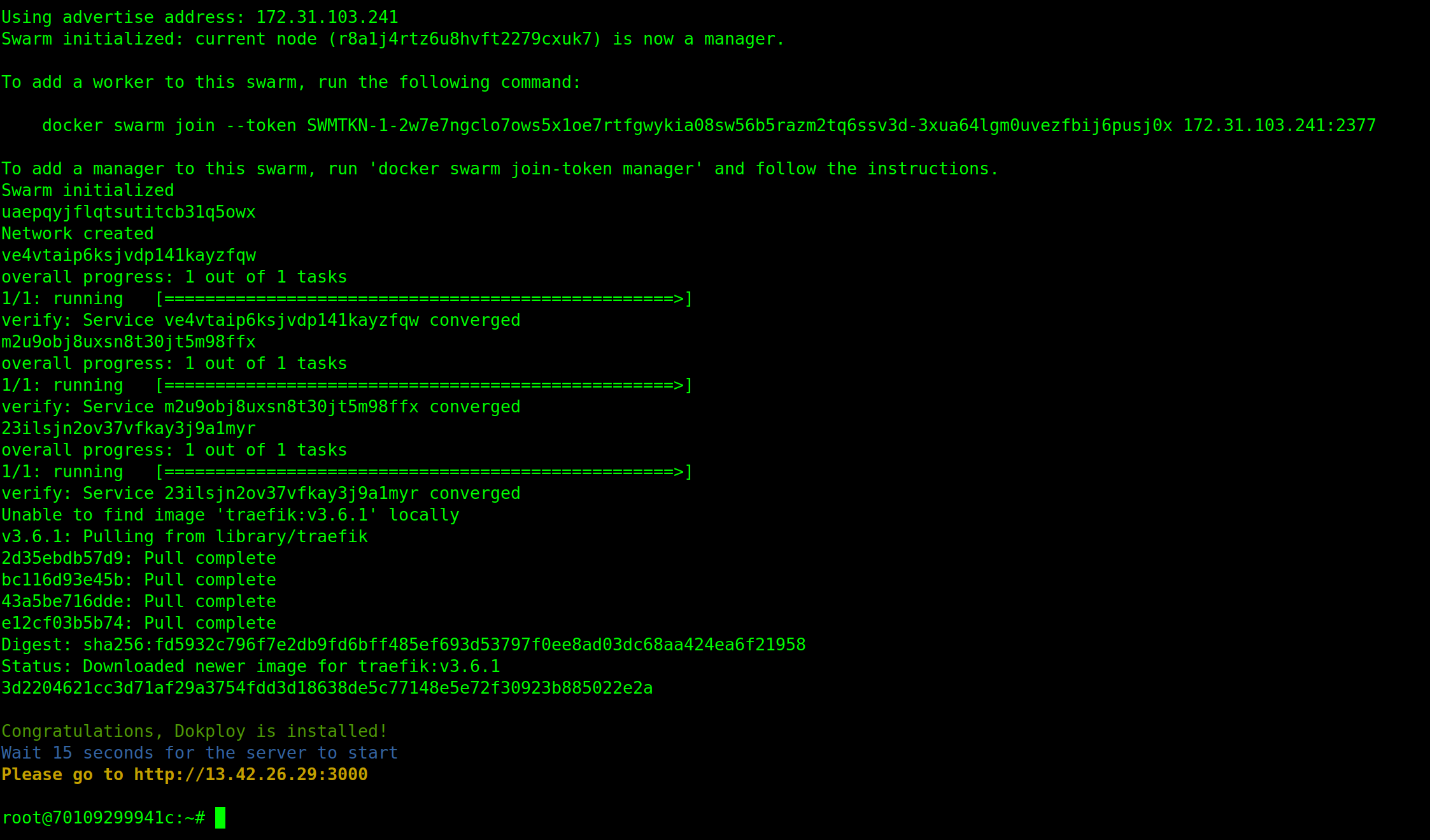 docker swarm init(si ce n'est pas déjà fait). C'est crucial car Dokploy utilise les services Swarm pour la gestion du réseau. (Même si je ne suis pas fan de Docker Swam il faut admettre que c'est bien pratique) -