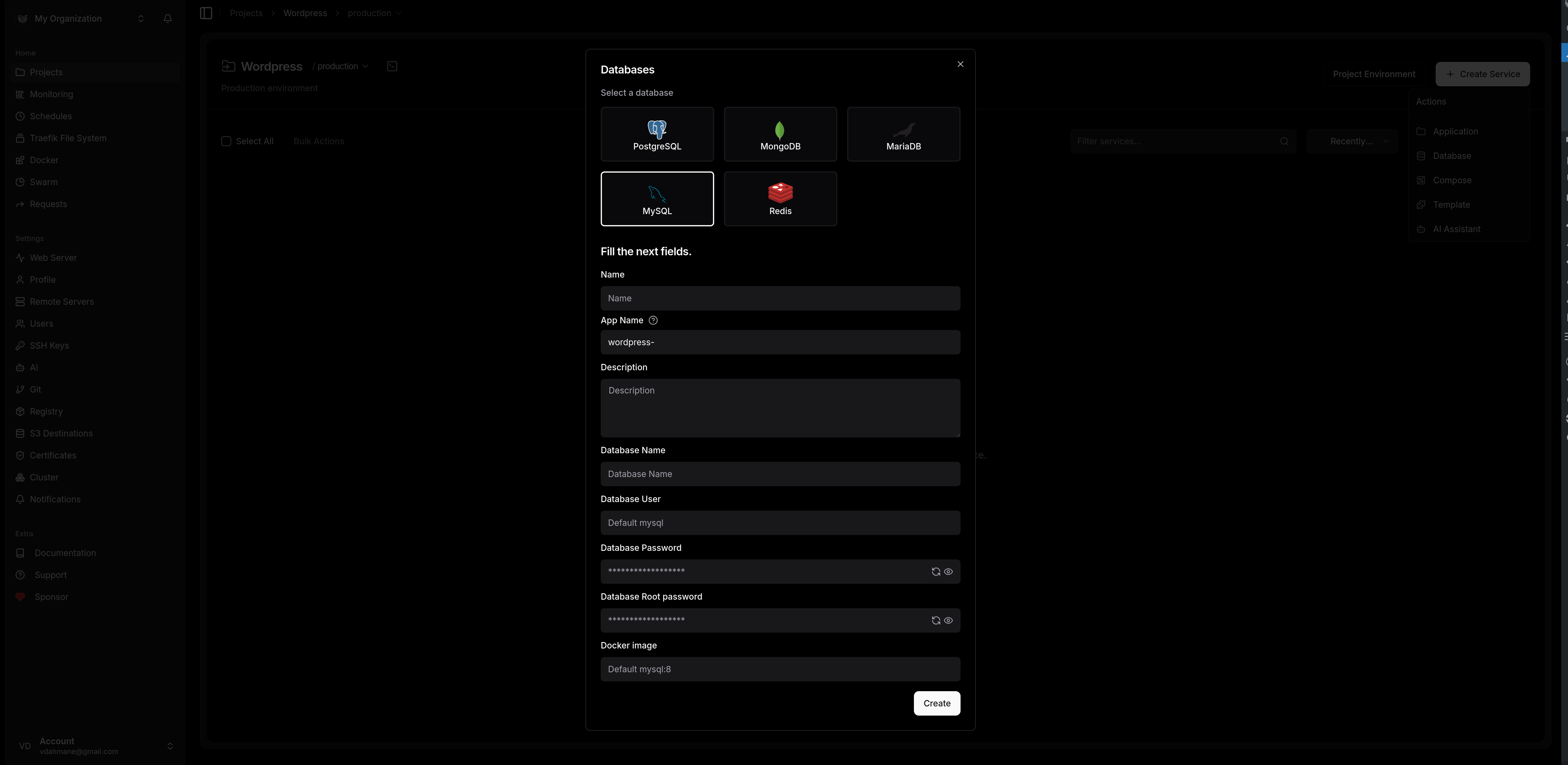 Comme vous pouvez le voir, l'éventail de choix est large ; pour ce tuto, nous partons sur une base MySQL. Remplissez simplement les champs de configuration et validez en cliquant sur "Create".