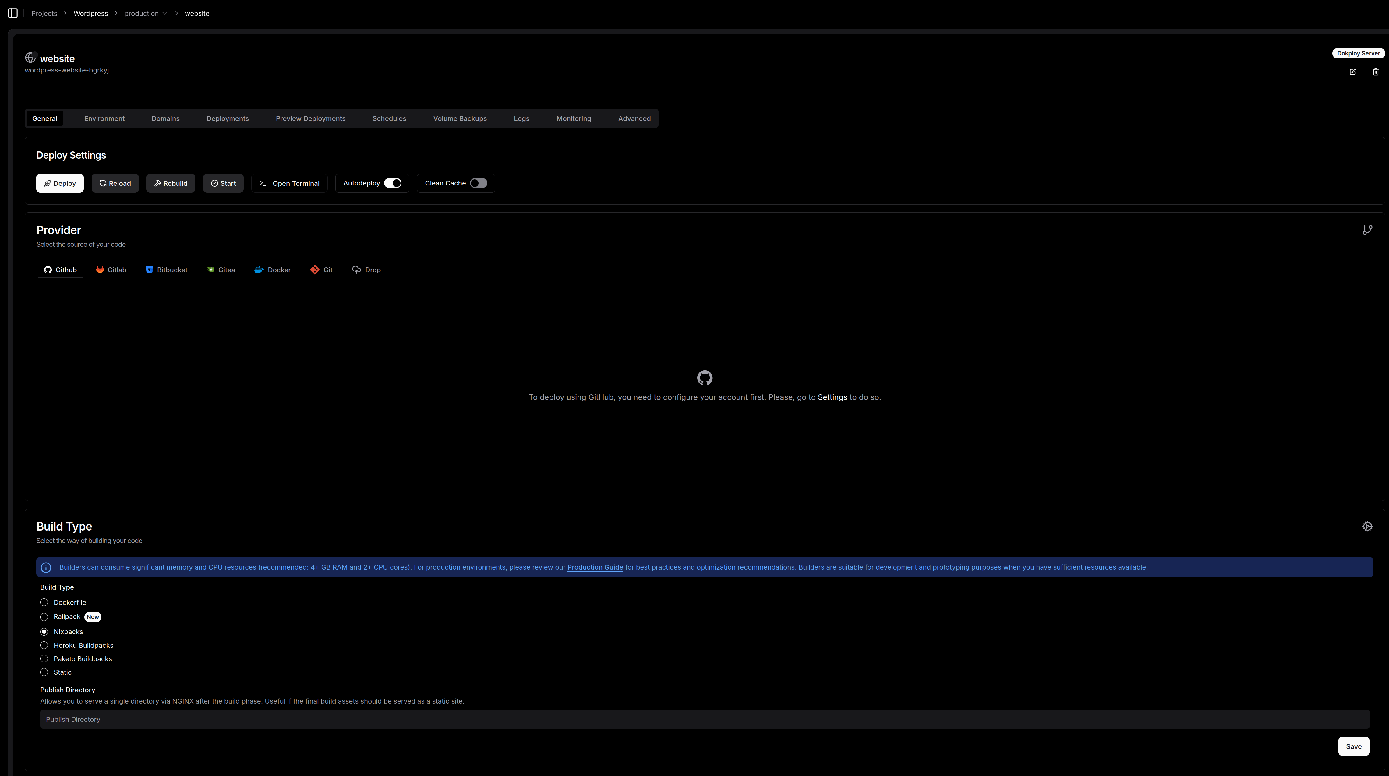 Nixpacks (par défaut) : C’est l'option moderne qui analyse votre code et crée l'image optimale tout seul.