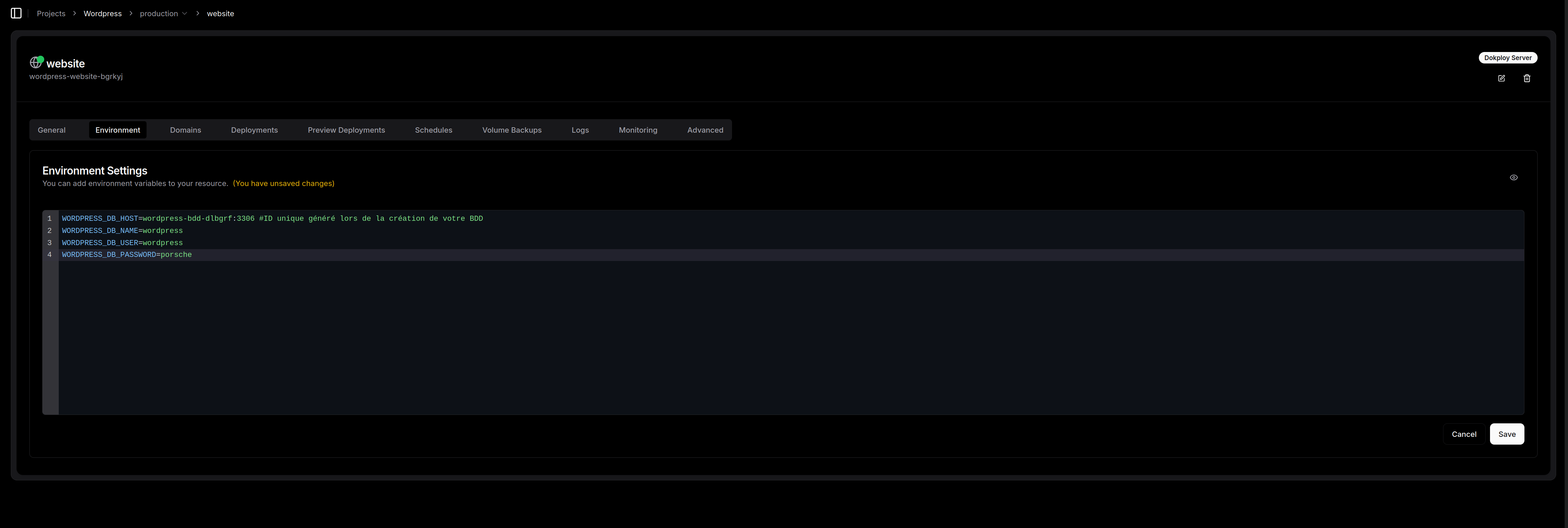 Container Port : Attention ici ! C’est le piège classique. Dokploy propose souvent le port 3000 par défaut. Mais notre image WordPress officielle, elle, écoute sur le port 80. Il faut donc impérativement changer cette valeur pour que Traefik sache où envoyer le trafic à l'intérieur du conteneur.